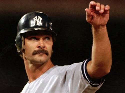 1 - Mattingly's mustache Mattingly's prowess came just before my time. I don't remember many specifics before the '96 season, so I don't fully appreciate how good Donnie Baseball was. I can look at his baseball reference page, but I don't have the same appreciation for him that people a few years older than me do. But one thing I'll always remember is Mattingy's stache. It was majestic, manly, and rugged. It brought the 80's musk to the 90's Yankees.