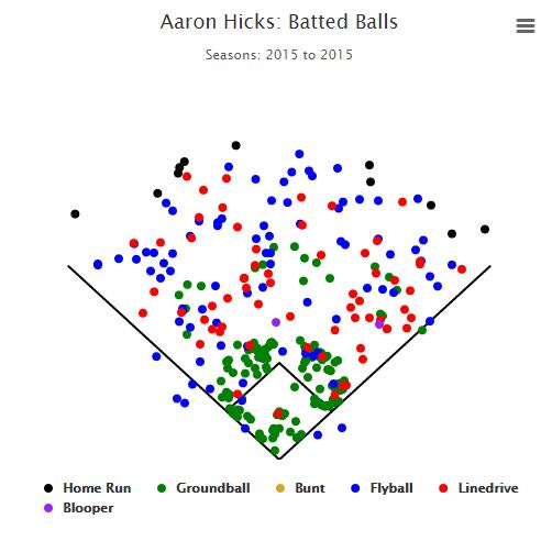 That 21% swing percentage at the very bottom left corner of the graph? It probably isn't producing any big time hits. A more disciplined, zone-focused approach could help Hicks take off in 2016 and look more like the player who was at one point one of the most highly ranked outfield prospects in the game. Hicks is undoubtedly hoping to fix his struggles from the left side of the plate for Yankee stadium so he can help baseballs meet the short porch in right field. Elevating pitches with line drives will ultimately be more productive than ground balls, which constituted 41.8% of the balls he put in play last season. Several graphs (like the one below) paint a pretty clear picture of Hicks. He’s certainly had his struggles, but over his first two seasons he’s steadily improved and was playing around the league average in several statistical categories last season.