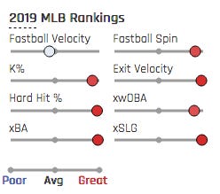 His 27% hard hit rate is in the top 3% of the league. His 32.7% K rate is in the top 8%, and his 84.7 average exit velocity is in the top 2%. This is the average exit velocity in each part of his plate: