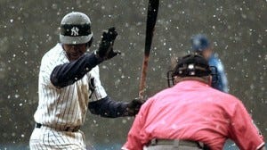 It was a cold, snowy Opening Day in the Bronx. The Yankees defeated the Kansas City Royals, 7-3. Starter Andy Pettitte allowed 3R in 6.1IP (6H, 2BB), earning the win. Newcomers Joe Girardi, replacing Mike Stanley, and Tino Martinez, replacing Don Mattingly, get booed during pregame introductions. Girardi goes 1-for-5 batting in the second spot and rookie shortstop Derek Jeter goes 1-for-3 hitting ninth.