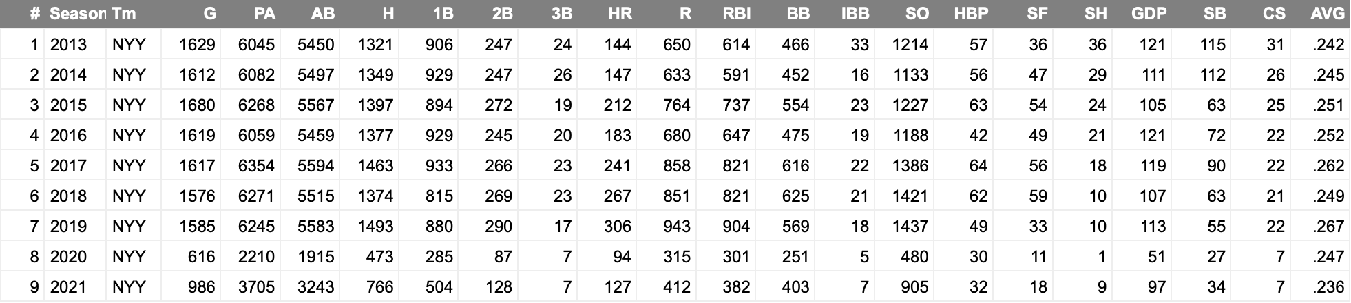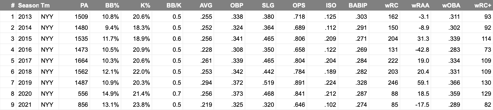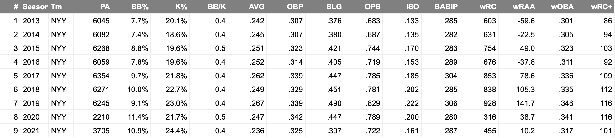 For this exercise, I am not paying attention to expectations. For example, the 2013 Yankees obviously had lower expectations than the 2021 Yankees. I am simply comparing the stats. Additionally, everything below is looking at the time period from 2013 to 2021.
