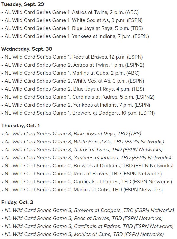 Where am I going with this? Well, March Madness has some new competition this year from what I’m calling October Madness. Over the next 4 days, we could have 24 playoff baseball games. Seriously, 24. There will be 8 games on tomorrow, take a look at this beautiful and insane schedule.