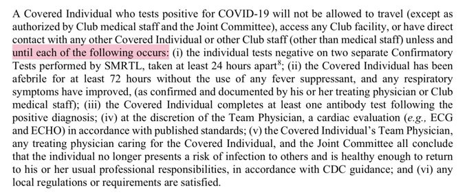 The criteria for when a “covered individual” who tests positive can return to their organization is below. A “covered individual” is a player, coach or umpire, as well as staffers such as clubhouse attendants.