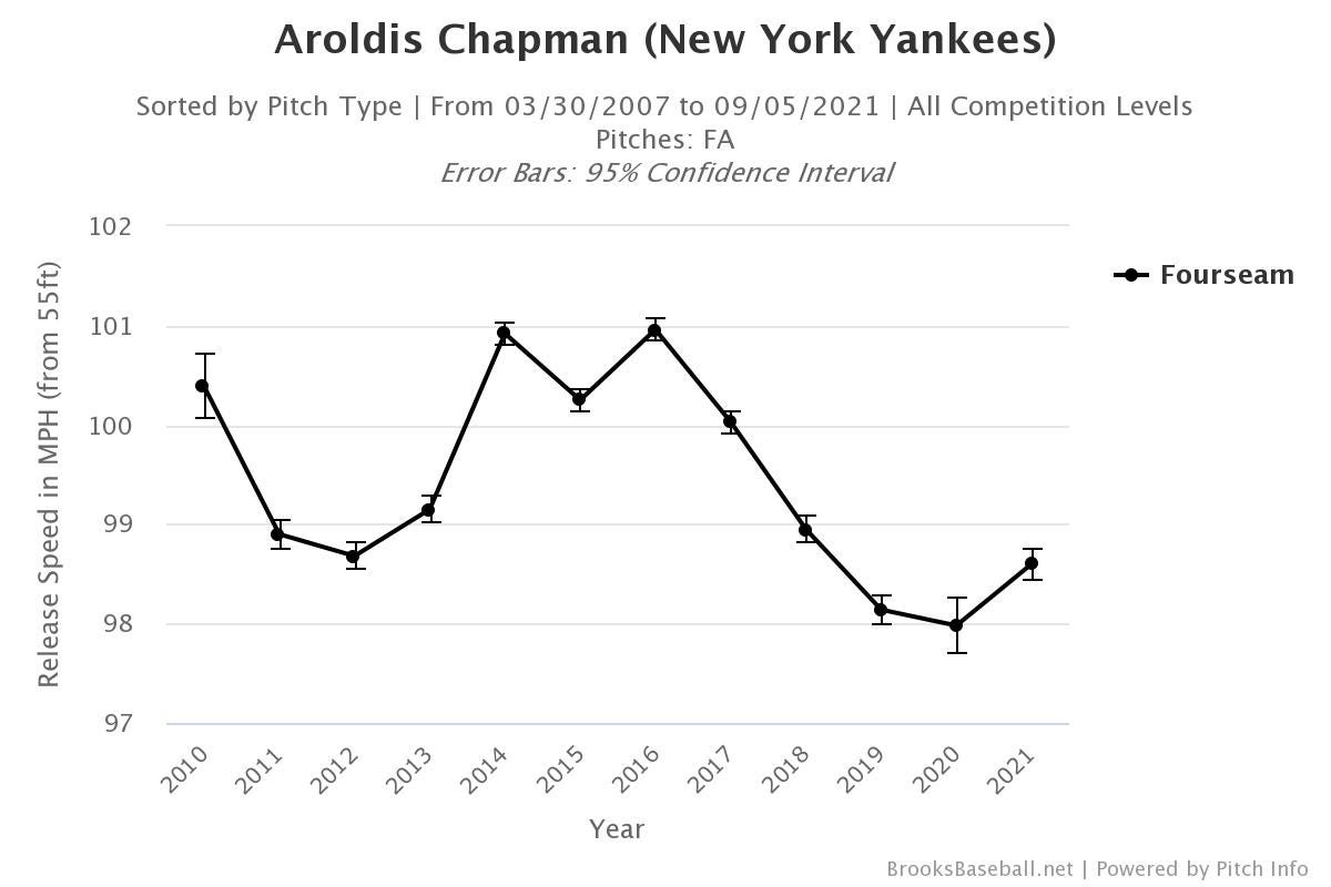 Pure velocity means little without command, which he clearly lacked on Saturday. However, even when he locates successfully, his heater simply isn't what it used to be. If he threw a pitch less than 96 mph when he first joined the Yankees in 2016, it would've been more likely to be some kind of offspeed or breaking pitch. He didn't throw any fastballs that year at 95.7 mph or lower, though he did hit 94 mph with a slider.