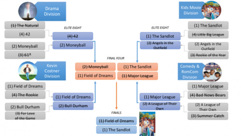 ICYMI: Baseball Movie March Madness Sweet Sixteen match-ups and results. ICYMI: Baseball Movie March Madness Elite Eight results and Final Four match-ups. Final Four (2) Moneyball v (1) Field of Dreams