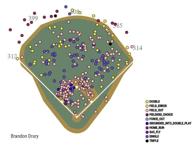 The dark pink dots, as we can see from the legend, represent home runs. The other colors over the fence are either singles, doubles, triples, or even outs(!). I count about 10-11 additional home runs for Drury. The obvious caveat being: not all of his at bats will come in Yankee Stadium, but I think you are starting to see my point.