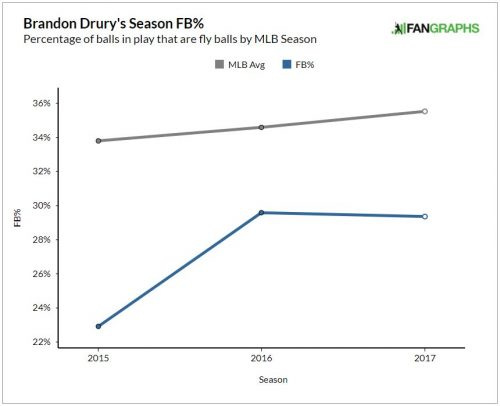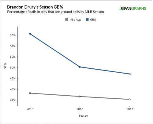 We can basically ignore 2015, only 56 at bats, but the 2016 and 2017 data is telling. Drury hits a lot of worm burners. Very atypical for a player with his isolated power.
