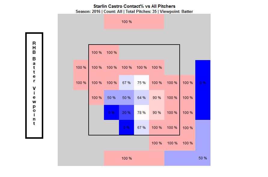 Starlin Castro just needed a change of scenery. Through two games, Castro has put up some impressive numbers, set a record, and won over scores of Yankee fans with a hot bat. Castro’s early success comes as no surprise, as he’s long been considered a special talent in the league, and he also had a relatively hot spring. But his first two games with the Yankees have been downright historic. His seven RBI are the most by any Yankee player in their first two games in pinstripes. Sure, two games is a limited sample size, but the Yankees have had plenty of RBI machines in their long and storied history. Gehrig, Ruth, Mantle, and even Maris weren’t able to conjure up seven RBI in their first two Yankees games. Castro also has a batting average of .625 and OPS of 1.875. This contact percentage heat map gives some bizarre insight into his success through two games.