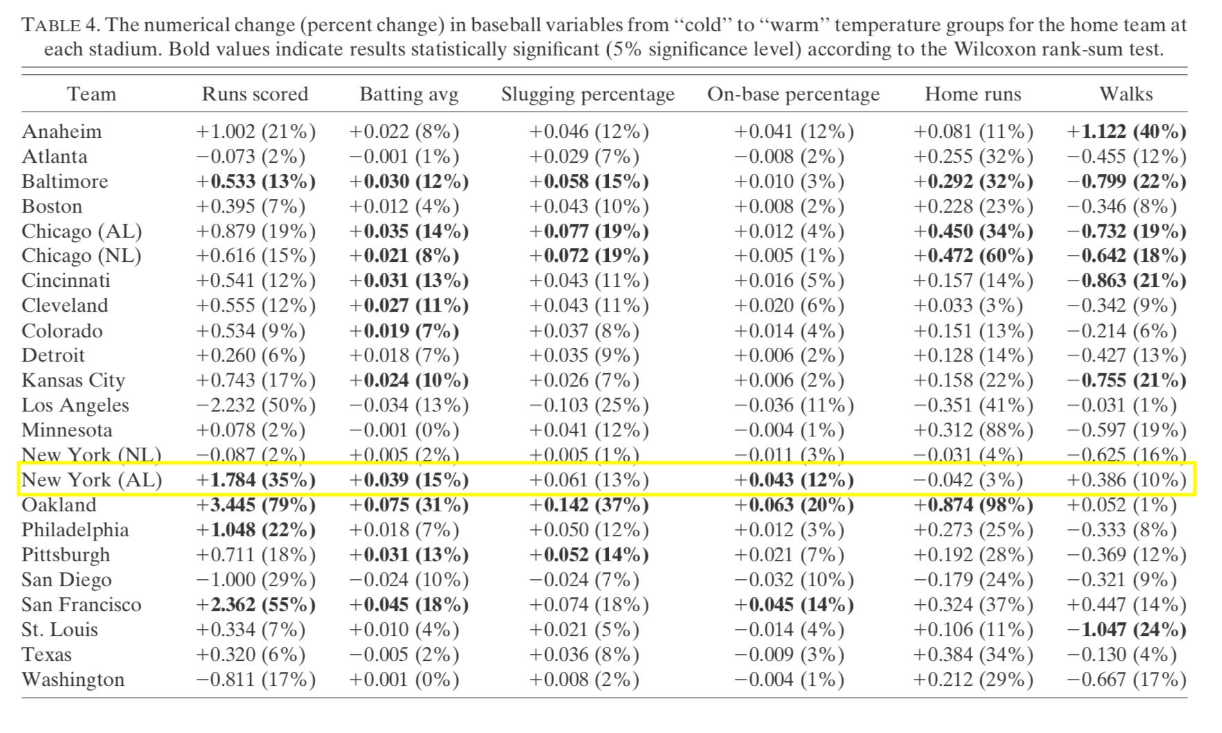How does this relate specifically to the Yankees? According to this study, playing in the American League will somehow allow them to truly see a spike in their offensive numbers as the weather heats up. Furthermore, as seen in the table below, being the home team at Yankee Stadium, they saw some of the largest increases in many of the categories of any team in the league.