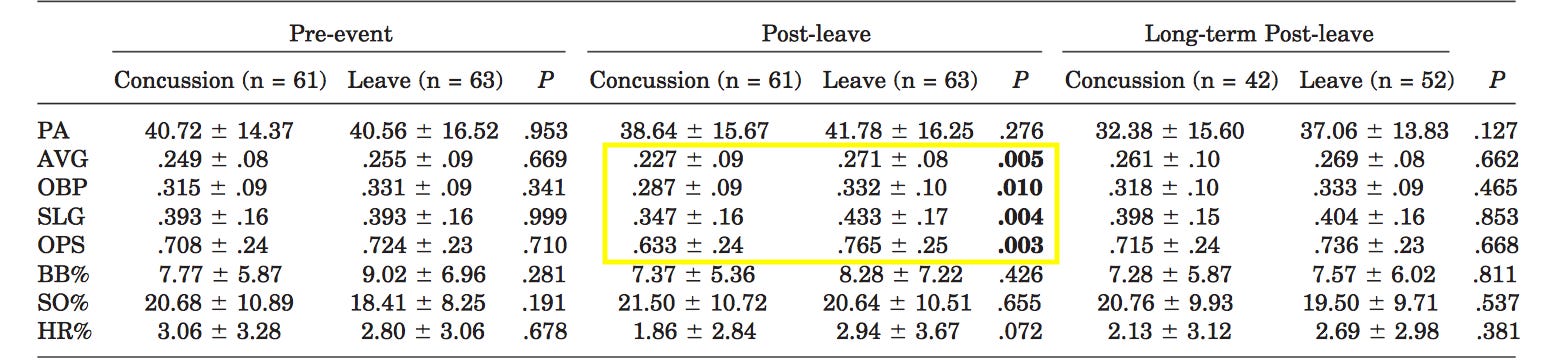 To make an estimation, I looked at a study that examined recent concussion history in the MLB and the impacts on performance. The study focused on players who had sustained concussions between 2007 and 2013. They looked at BA, OBP, SLG, OPS, BB%, K%, HR/AB during three periods: the two weeks before the injury, the two weeks after return, as well as four to six weeks after return. They then compared these stats during these periods to players who had missed time due to paternity or bereavement leave.