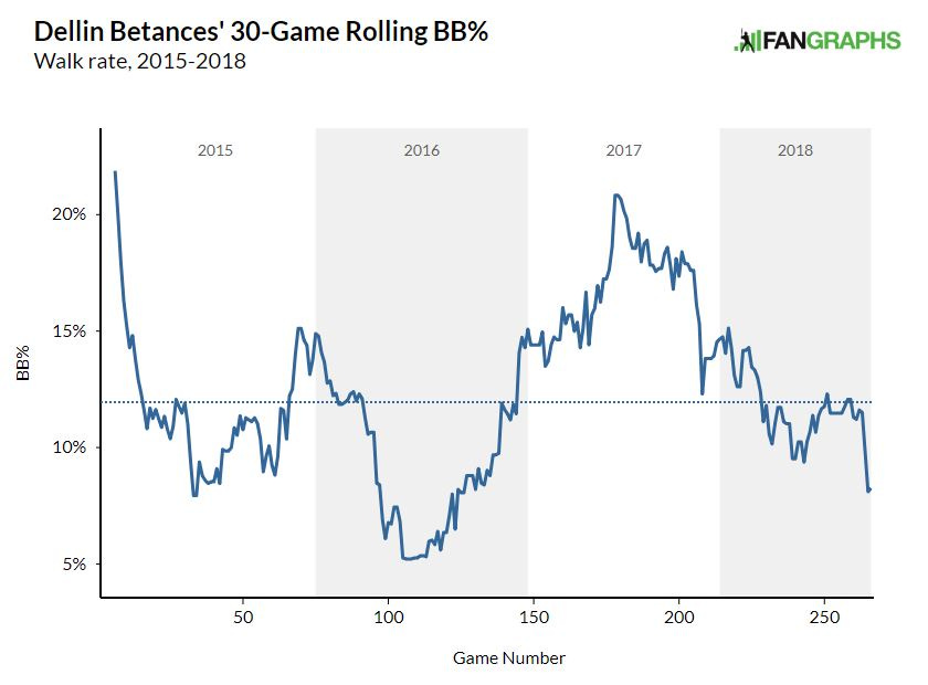 Below is Dellin’s walk percentage by day the last few years. You can see how much he has improved this season in contrast to last: