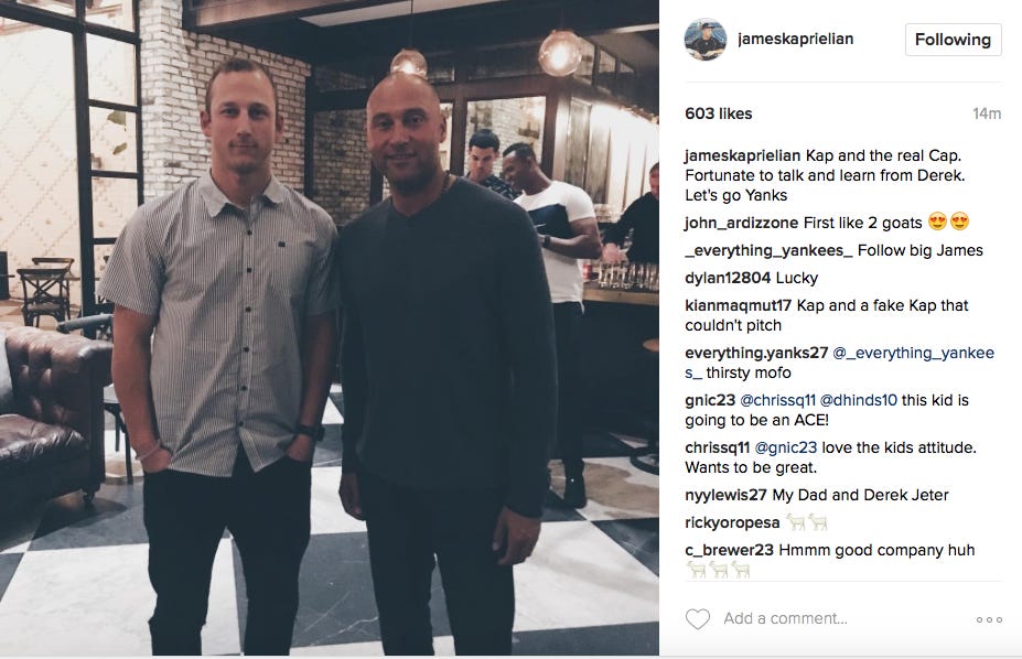 In what is seemingly becoming an annual spring training rite of passage, a group of the Yankees' top prospects were treated to dinner with none other than The Captain, Derek Jeter. Justus Sheffield, Blake Rutherford and James Kaprielian are just a few of the players who have posted pictures to social media of themselves with Jeter, looking excited to be in the presence of a Yankee legend -- as you would expect. About 20 prospects altogether were at Oxford Exchange, a restaurant in Tampa, on Tuesday night. Jeter is starting to make this a regular event. The prospects that are involved in the organization's "Captain's Camp", which strives to teach young players how to handle life on and off the field, have been surprised in each of the past two years by Jeter at dinner during spring training. It's a good opportunity for the Baby Bombers to pick the brain of a guy who was once in their shoes. Although he hasn't remained visible at the Stadium, Jeter is quietly still involved with the organization and working with young players, often lending advice or guidance here and there. I think it's safe to say that Jeter picked up the check.