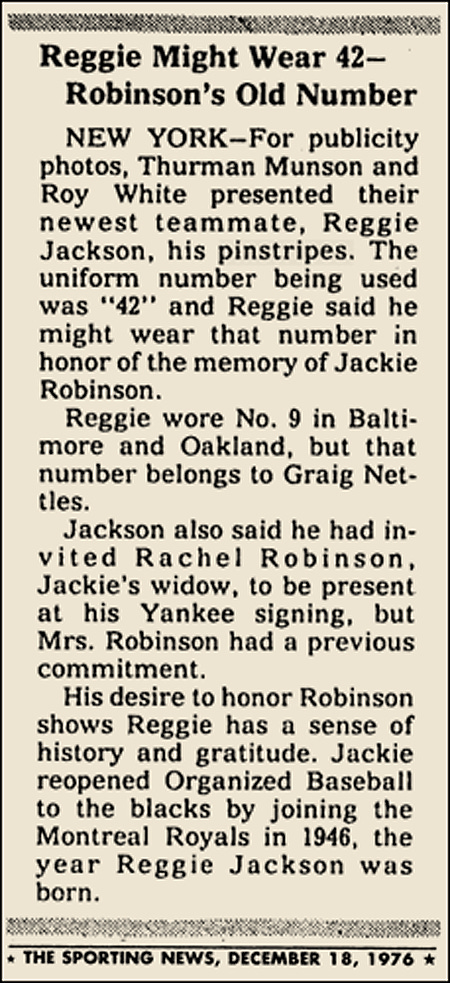 Jackson had to look for a new number because his traditional 9 was worn by Craig Nettles, but luckily 42 was being held by Billy Martin for incoming pitching coach Art Fowler. Reggie went on to wear 20 for Frank Robinson, but changed to 44 during Spring Training for Hank Aaron and had that number retired in 1993.