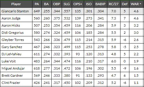 For the more saber savvy folks, let’s take a look at the projected WAR leaders. Keep in mind WAR takes offense, defense, and base running into account. Here is both the reference chart, and the Yankees leaders according to ZiPS: