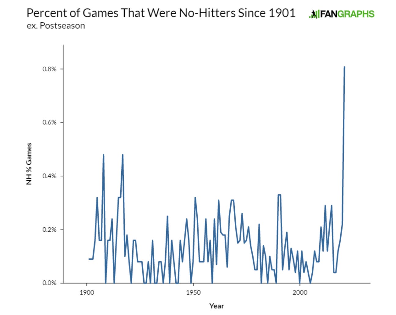Kluber’s performance comes a mere one night after the Tigers’ Spencer Turnbull no-hit the Mariners in Seattle. This marks the first time that no-nos have been thrown on consecutive days since 1969. The funny thing is, the six no-hitters have all been on the road, and they have all come against a combined three different teams: the Rangers, the Indians, and the Mariners. I can’t imagine it feels good to be no-hit twice at your home ballpark within a month. The last time this many no-hitters had been thrown at this point in a season was over a century ago: way back in 1917. Just take a look at the percentage of games that have been no-hitters, and keep in mind this graph was created before Turnbull and Kluber's performances:
