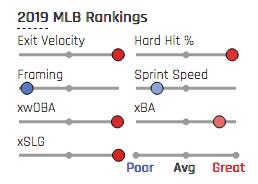 His Exit Velocity is in the 99th percentile, his Expected Weighted On Base Average (xwOBA) is in the 98th percentile, his Expected Slugging (xSLG) is in the 100th percentile, his Hard Hit % is in the 95th percentile, and his Expected Batting Average (xBA) is in the 81st percentile. His sprint speed is pretty bad and I'm sure it'll come off as him not hustling, but whatever. I don't need Gary to bust down the line. I need Gary to hit balls so hard, he's shooting lasers across the field. The result should be severed limbs.