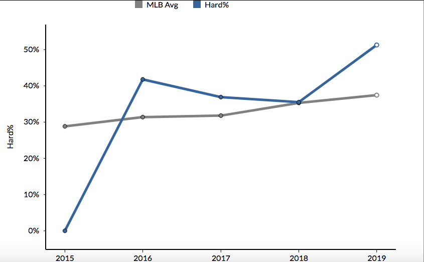 It's crazy how much power Gary Sanchez has gotten back now that he's healthy. In 2018 he had a Hard Hit % of 36% and this year it's at 51%. (That kind of spike used to be induced medically.) It's actually the most power Gary has ever exhibited. In 2016 he had a 42% Hard Hit % and in 2017 it was 37%. Everyone remembers that 2016 for Gary but this year, he’s even more of an animal.