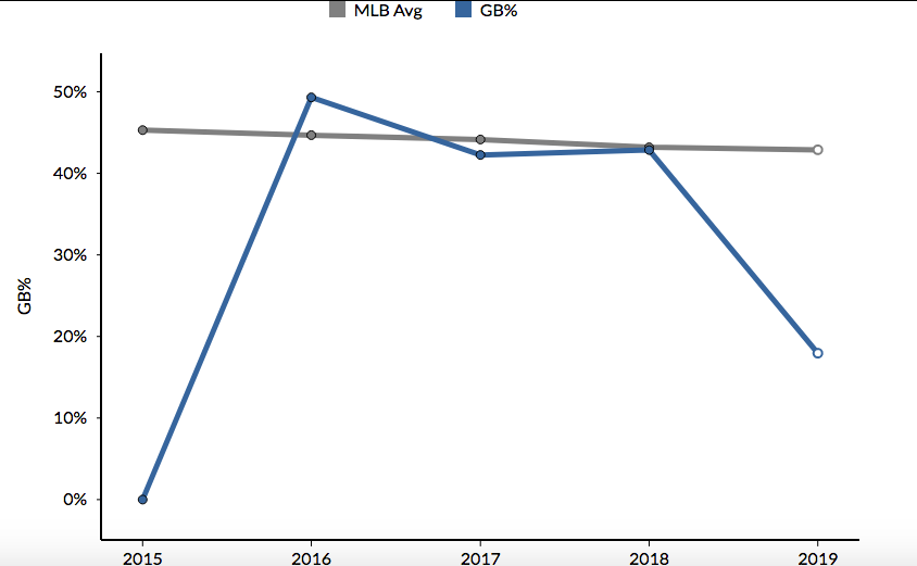 The funny thing about looking at this chart is that, in 2018, his worst year, he was exactly at league average. Terrible for Gary Sanchez is essentially the bare minimum for everyone else. Another interesting thing to look in to is Gary’s Ground Ball %. When Gary was struggling between his bum shoulder and hammy in 2018, it seemed like he was a rally killer. There would be a man on first and second with one outs and with Gary up, he’d make contact but it’d slowly dribble to the second basemen. Easy double play and the inning was over. Last year it seemed most of his hard hit balls were on the ground, which don't usually lead to good things. In 2018 he had a 43% GB% and now, this year, a year where he's slugging well over .600+, his GB% is a meager 18%. He essentially cut it in half.
