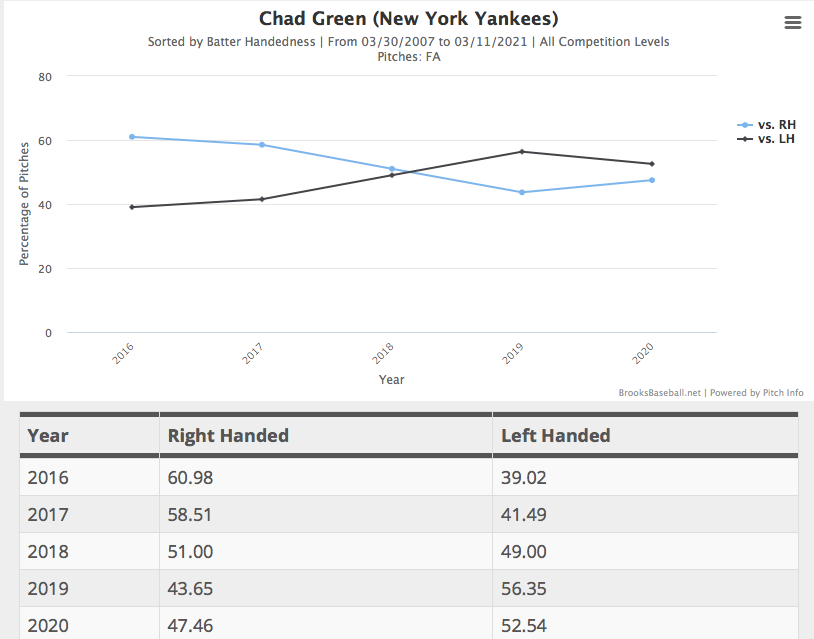 Brooks Baseball is a great place to find all kinds of data and charts for pitchers and hitters. They can create some really detailed and modern stats. Here are two simple charts to detail what makes Green and O'Day effective against lefties. The first chart is the percentage of pitches Green has used his fastball against righties and lefties. Before the truncated 2020 season, Green had been steadily increasing the number of fastballs he threw lefties while decreasing that percentage against righties. Without a changeup to neutralize lefties, he's turned to elevating that fastball. Hence the big number of strikeouts, low number of hits but higher rate of home runs.