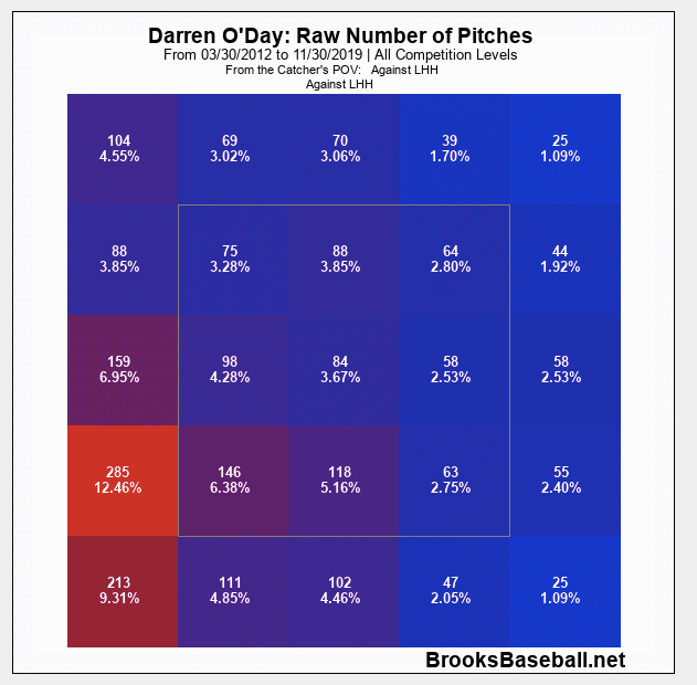 O'Day on the other hand wants to go low and away with his pitches against lefties, as shown in the heat chart below. According to Brooks Baseball, his fastball averages just 86 mph, but his sidearm delivery and backdoor slider, along with staying out of the sweet down and in zone of lefties is what makes him so effective.