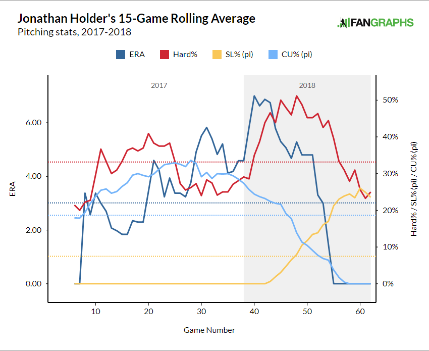 This chart shows 15-game rolling averages to get a sense of short term improvements. This season, as Holder has thrown fewer curves and more sliders, his ERA and hard hit % have both dropped. In fact, the point in which the 15 game average of sliders was greater than the average of curves is like an inflection point for when Holder’s results drastically improved.
