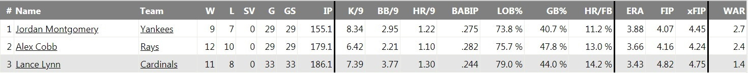 While everyone remembers Severino bursting onto the scene last season throwing 100 and finishing 3rd in the Cy Young voting, Montgomery is often forgotten. MLB Network pundits and other baseball gurus alike were clamoring for the Yankees to go out and get an Alex Cobb or a Lance Lynn. But Guess what? The Yankees have an even better option in Montgomery. Refer below to last season’s statistics comparing the three pitchers: