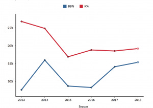 In terms of pitch types, Hicks has been mashing fastballs in 2018. His fastball runs above average this year is 15.2. Last year it was 7.9, but before that the highest it had been was 0.4. In fact, his runs above average on sliders, curveballs, changeups, and even split-fingers are all career-highs.