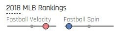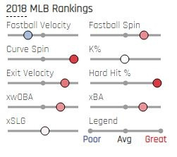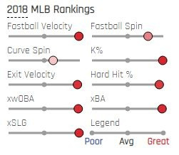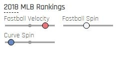 What I like about Chapman’s graphic is that it can show you why his fastball is so elite. It’s not just that he throws harder than pretty much everyone else, but that his spin rate is crazy high. Combine 100 mph + with that spin, and it’s no wonder batters have such trouble catching up. The only downside here is that with such a high octane fastball, when batters hit it, they can hit it hard. But the predictive metrics are great which shows that Chapman limits the impact of those hard hit balls.