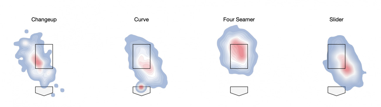 The numbers are clearly elevated against his fastball. And take a look at where his fastballs are located – most of them are middle and up. The other pitches are typically located in much less appealing spots.