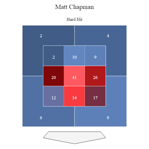 Two of the most important batters on the A’s this season were the Matt’s: Olson and Chapman. Olson is a left-handed first basemen who hit .247/.335/.453 with 29 home runs. Chapman is well on his way to becoming the best third basemen in the game through his defense, but he can hit as well. This year he hit .278/.356/.508 with 24 home runs. Let’s break down their batted ball preferences and tendencies and see who on the Yankees will match up well with them.