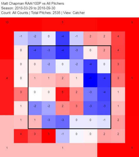 Chapman has almost the opposite pitch preferences from Olson. He feasts on fastballs and has minor struggles against curveballs. Against fourseam fastballs, Chapman’s wFA is 7.0 runs above average and he is 3.5 runs above average against sinkers. Conversely, he is 0.8 runs below average against curveballs. Next, let’s take a look at where he likes the ball: