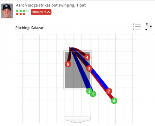 The pitch that has plagued Judge the most is the breaking ball down and away that he tends to chase. Here are a couple of instances where he elected to chase a pitch way out of the zone: