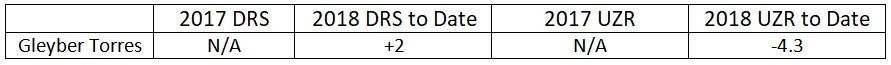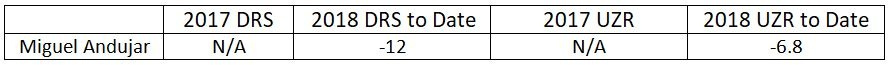 While Miguel Andujar has been a really nice player offensively, there is really no sugarcoating his defense at this point in the season. The metrics don’t like him. This is mostly due to poor range, according to the “range” factor that is included in the UZR calculation. This is to be expected, however, and I think as long as he’s not making a lot of errors (only 4 this season) the Yankees are going to live with the growing pains, because his bat is so electric.