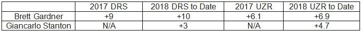 Even though Brett Gardner is approaching 35 years old, he can still fill in at center field on occasion. The Yankees are using him there just often enough to get some extra value. He still plays the position above average, and I have included his numbers below for reference.