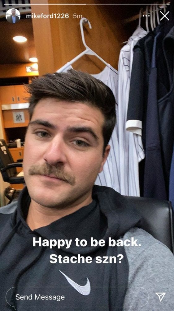 All I’m saying is the Mike Ford’s mustache could be a rallying cry for this team after their very slow start. I’d like to think that instead of doing Gardner’s patented bat bang whenever they get a hit, they will now hold up a finger mustache. But I’ll settle for a much-needed win. #StacheSZN