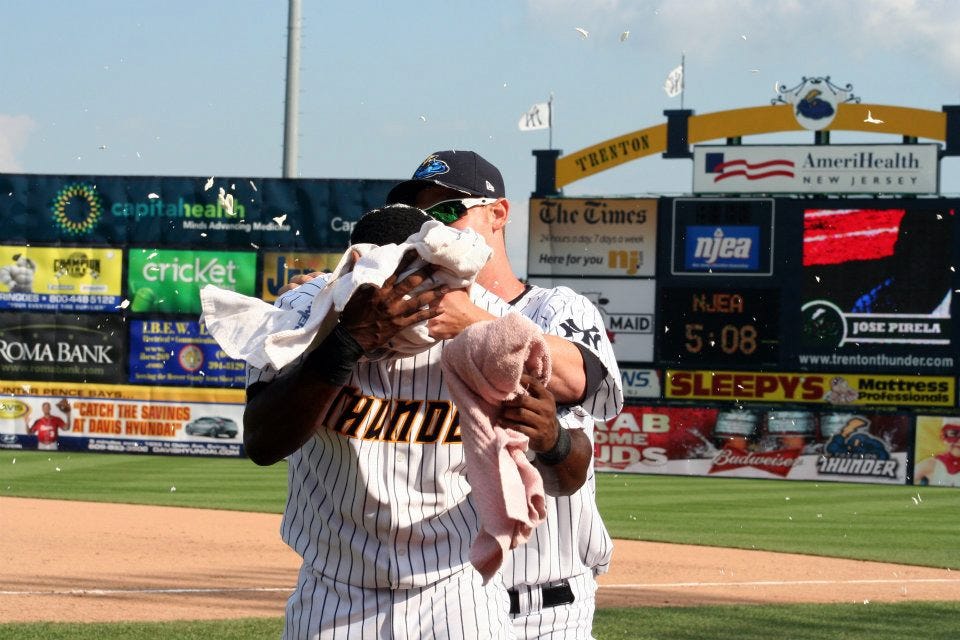 Jose Pirela gets hit with a pie to the face after hitting a 12th inning walk-off home run (Photo Credit: Trenton Thunder)