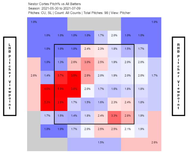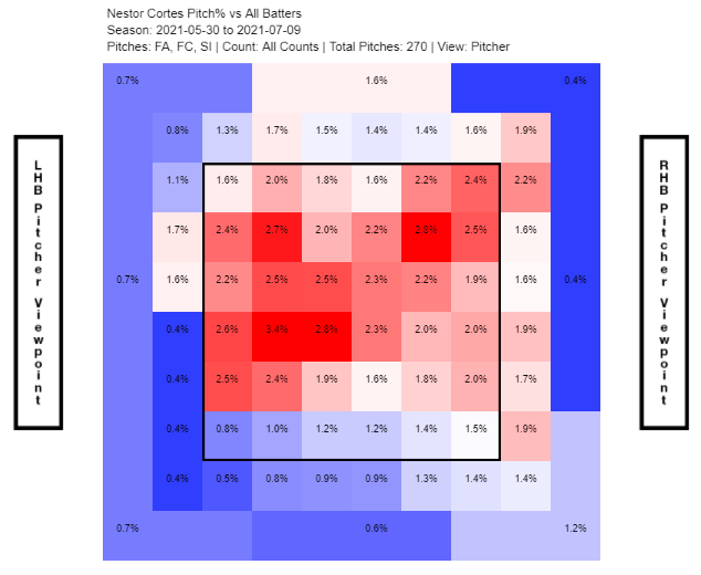 All pitchers need to hit their spots, but soft-tossers like Cortes need to be especially pristine with their command. He fills up the strike zone with a zone rate of 53.7 percent— well above the MLB average of 42.2 percent. Here's where he locates his fastballs: