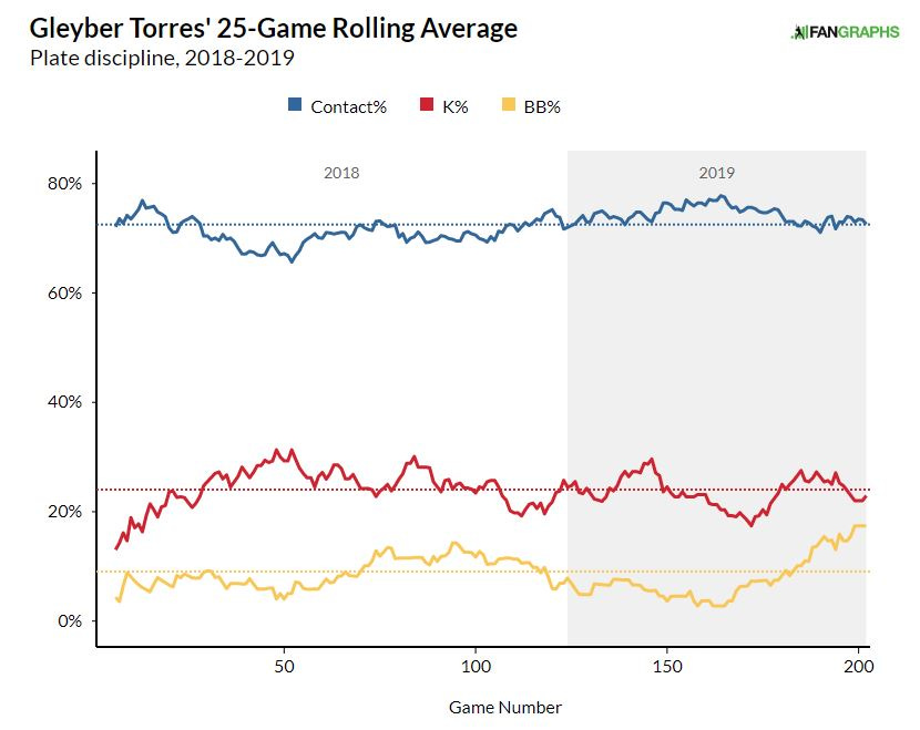 This helps us understand what decent walk rates and strikeout rates are. Gleyber is just in his sophomore season, but he’s already making improvements in some key offensive categories. Last year his walk rate was a solid 8.7%, but it has improved to 9.7% so far this season. His strikeout rate last year was 25.2%, which is a bit high for a middle infielder, but he has improved that mark to 22.4% this year. That’s still a tick below average, but when you consider the power that Gleyber has displayed, it’s perfectly acceptable. Lastly, his overall contact rate has gone from 70.9% in 2018 to 74.4% this year. Take a look at the graph below to help visualize his improvement in these categories.