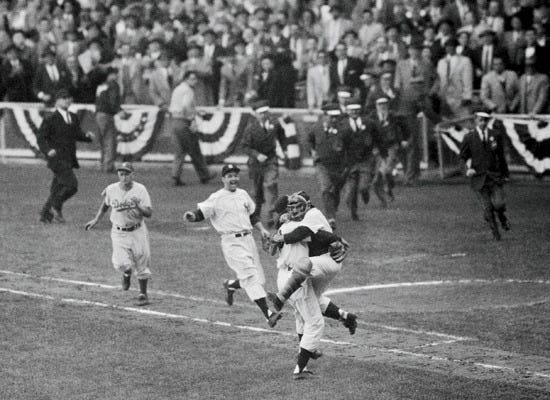 The count was 1-2, as Don Larsen went into the windup and delivered home to catcher Yogi Berra. Pinch hitter Dale Mitchell of the Brooklyn Dodgers check swung, but home plate umpire Babe Pinelli called strike three. Berra darted out from behind home plate, and in one of the most iconic moments in baseball and sports history, jumped into Larsen as he was jogging off the mound, wrapping his legs and arms around the then 26-year-old right-hander. Larsen caught him, and carried him a few feet before the rest of the Yankee team swarmed the two men. The Yankees defeated the Dodgers 2-0, and took a 3-2 lead and eventually won in seven games.