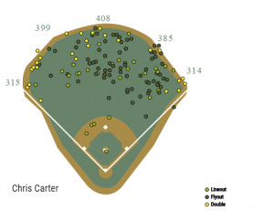 Here's a chart showing all of Carter's doubles, flyouts, and lineouts last season overlayed onto Yankee Stadium. At first glance it looks like only a few more home runs would be hit in the Bronx, but after individually looking at each point and the distance it covered I found that that there's potential for an additional 10 or so home runs. That's pretty significant.