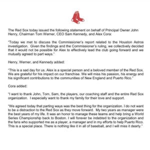 The Sox and Cora later issued a mutual statement, and a press conference is scheduled for Wednesday afternoon at 1 P.M.