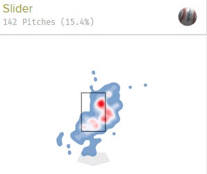 His pitch arsenal wasn't quite the same as it is now. Notably absent was his devastating cutter, which he throws 40% of the time in 2022. He didn't incorporate that pitch until last season. He primarily featured a four-seamer/slider/changeup mix in 2019. His slider in particular illustrates the difference between control and command. Here's his slider heat map from 2019: