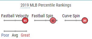 Both in terms of the top-end on his fastball as well as the variation between his pitches. His fastball averages right around 97 mph and his curve comes in closer to 85. Importantly, his spin rates are elite: