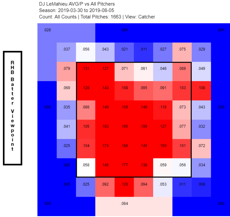 He's flat out good. I don't think his 2019 is flukey, even considering the inherent randomness of lots of balls in play. He's done this before. LeMahieu is a smart hitter who can force pitchers into awkward situations; it's hard to pitch him. His heatmap tells the story: