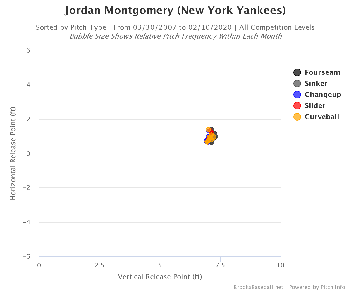 Jordan Montgomery missed nearly the entire 2018 and 2019 season recovering from Tommy John surgery which makes it easy to forget he was great in 2017 pitching to a 3.88 ERA in 155 innings with a 22% K rate. Monty is known as a young crafty lefty who keeps hitters off-balance with nearly identical over the top release points on all of his pitches: