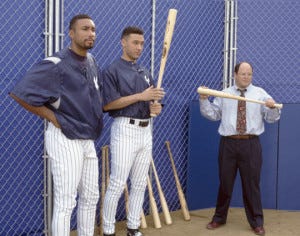 Bernie and Derek got a hitting lesson from George in The Abstinence. George's girlfriend gets Mono which means no sex. Without sex constantly on his mind, things become clearer allowing him to realize his full intellectual potential. As a result, he tries to pass on some of that wisdom to Derek and Bernie showing them how to hit a home run. "Guys, hitting is not about muscle. It's simple physics. Calculate the velocity, v, in relation to the trajectory, t, in which g, gravity, of course remains a constant. It's not complicated." Jeter then reminds George that they just won the World Series.