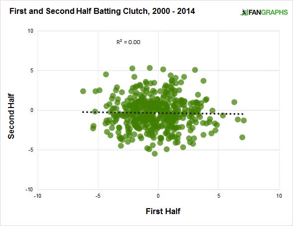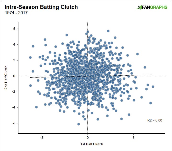 Here is a graph showing the correlation for team’s clutch metrics between the first and second halves of a season. Not even year-over-year, but within the same season. This would account for someone just having a “great year.”
