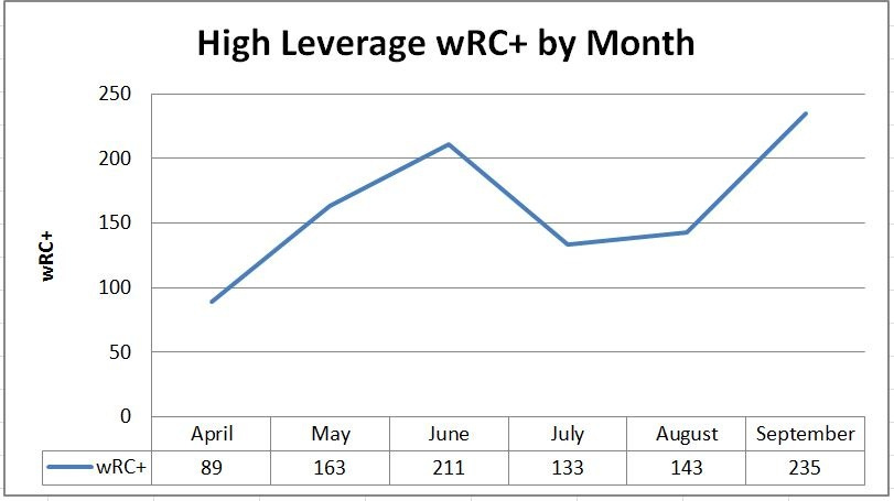 As a SABR nerd and a proud member of #BPNerds, I am skeptical of any stats that involve being clutch because we have a plethora of data and research which tell us that being clutch is not repeatable, which means it isn’t really a skill. And I’ll get into some of that research later on in this article. For now, I wanted to look more deeply at the Yankees clutch hitting this year to see how they have done it. Instead of looking at the season-long number, I broke it down by month to see how the team has performed in high leverage situations as the season has gone on.