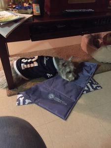 This is Dory, who belongs to Delia. It turns out that Dory was sad in this picture because the Yankees were losing. Hopefully the team sees this and never loses again.