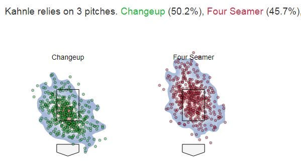 That video should honestly be removed from Twitter for inappropriate content. That changeup is so good he got 2 swing and misses in that at-bat on pitches right down the middle. In fact, the whiff rate on his changeup this year is 49.6%! That means basically half the time batters swing at his changeup they miss. And in the chart above, you can see he throws his changeup in the zone a lot, which means batters can’t even make contact in the zone. It’s ridiculous and so cool to see.